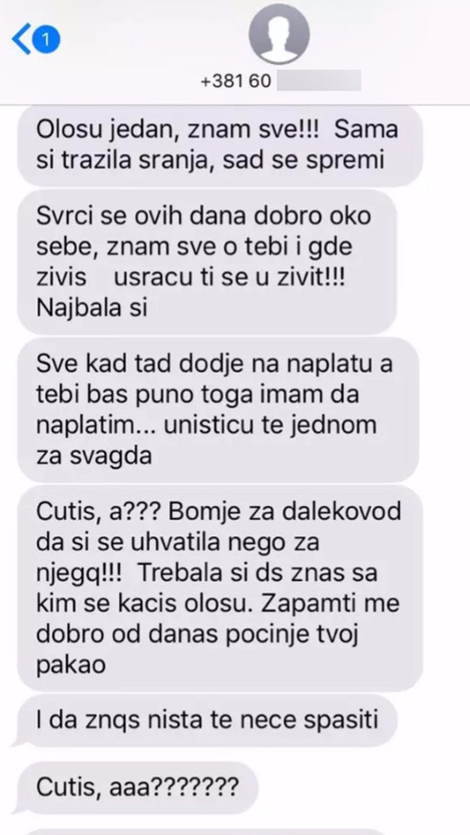 Svaki čas joj stiže poneka takva poruka, stvarno je jezivo. Ona uopšte ne odgovara, pa je ta osoba pokušala da uhodi i njene drugarice i na taj način stupi u kontakt sa Sorajom. Čak smo joj i savetovali da se skloni nakratko iz Srbije dok se sve ne stiša, ne vidim drugo rešenje. Pokazivala mi je te poruke koje su joj stizale, evo, pokazaću vam - rekao je izvor koji je želeo da ostane anoniman i dao nam na uvid "skrinšot" na kojem se jasno vidi o kakvim je porukama reč upućenim na Sorajin broj mobilnog telefona.