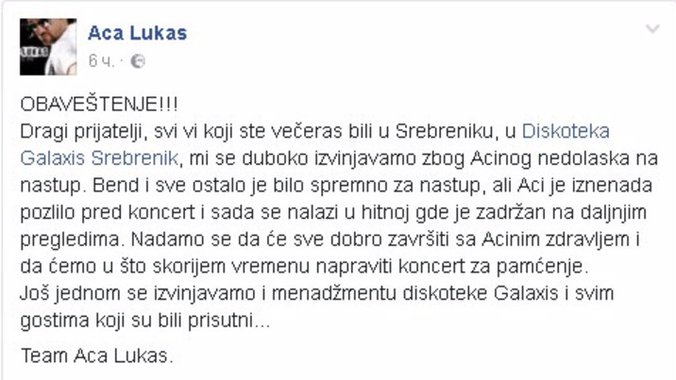 Aleksandar Vuksanović, poznatiji kao Aca Lukas sinoć se nije pojavio na zakazanom nastupu u Srebreniku zato što mu je pozlilo.