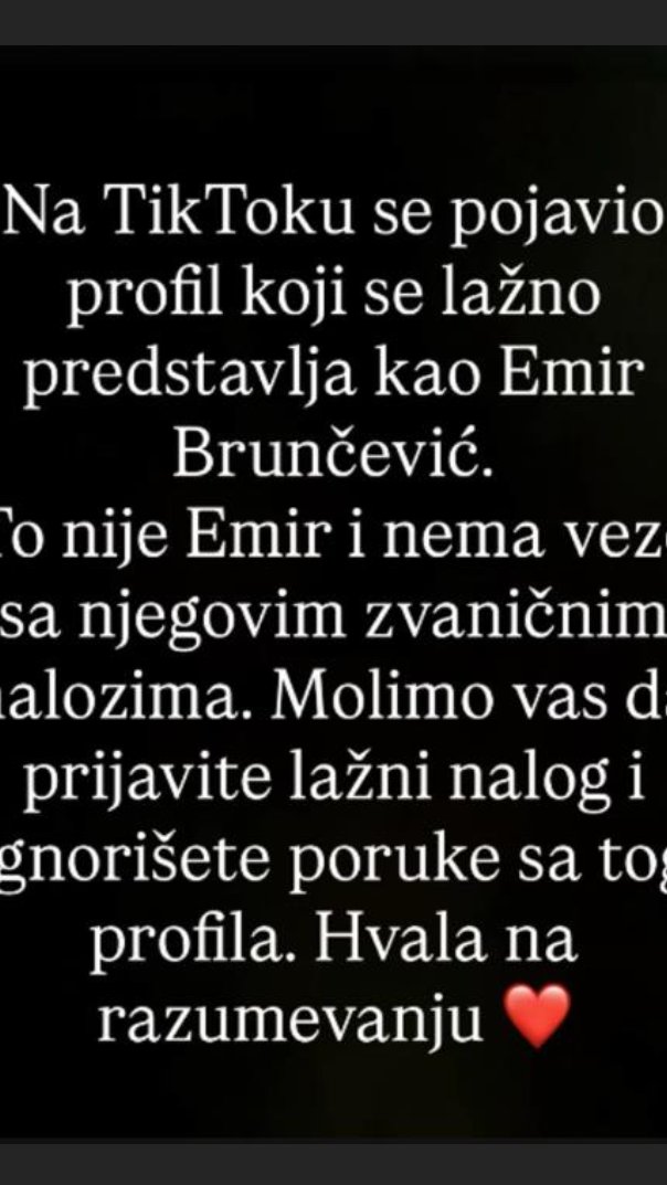 "Na TikToku se pojavio profil koji se lažno predstavlja kao Emir Brunčević. To nije Emir i nema veze sa njegovim zvaničnim nalozima. Molimo vas da prijavite lažni nalog i ignorišete poruke sa tog profila"