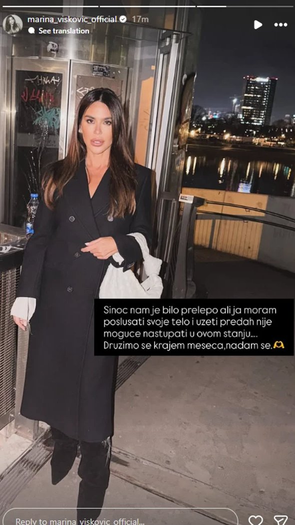 – Sinoć nam je bilo prelepo, ali ja moram poslušati svoje telo i uzeti predah. Nije moguće nastupati u ovakvom stanju. Družimo se krajem meseca, nadam se – napisala je Marina.