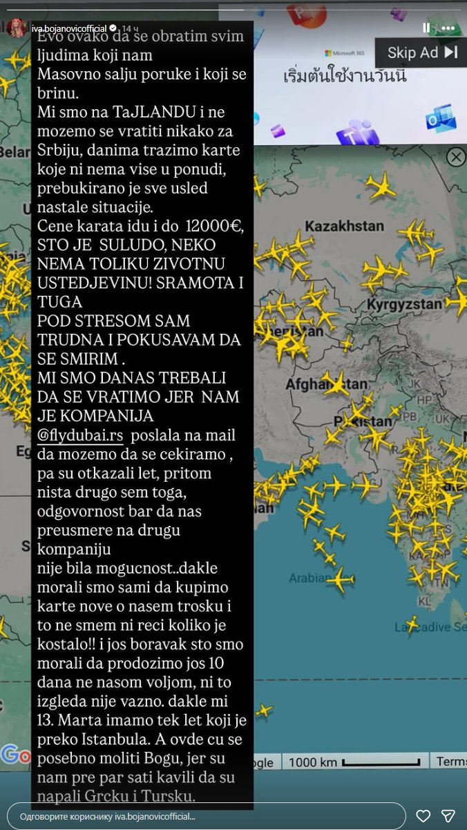 - Evo ovako da se obratim svim ljudima koji nam masovno šalju poruke i koji se brinu. Mi smo na Tajlandu i ne možemo se vratiti nikako za Srbiju, danima tražimo karte koje ni nema više u ponudi, prebukirano je sve usled nastale situacije. Cene karata idu i do 12.000 evra, sramota i tuga. Pod stresom sam, trudna i pokušavam da se smirim - istakla je.