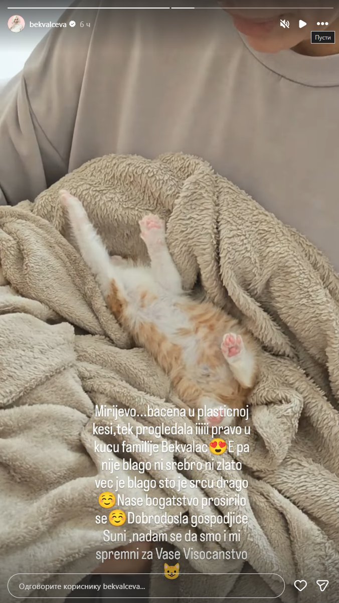 - Mirijevo... Bačena u plastičnoj kesi, tek progledala i pravo u kuću familije Bekvalac. E pa nije blago ni srebro ni zlato, već je blago što je srcu drago. Naše bogatstvo proširilo se. Dobrodošla gospođice Suni, nadam se da smo i mi spremni za Vaše Visočanstvo - napisala je Nataša Bekvalac.