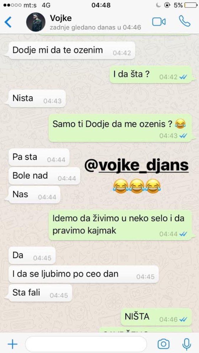Izgleda da je reper opasno pao u iskušenje da oženi svoju devojku, a sve to potvrđuje prepiska između Sare i Vojketa, koju je pevačica i bivša zadrugarka objavila na društvenoj mreži Instagram.