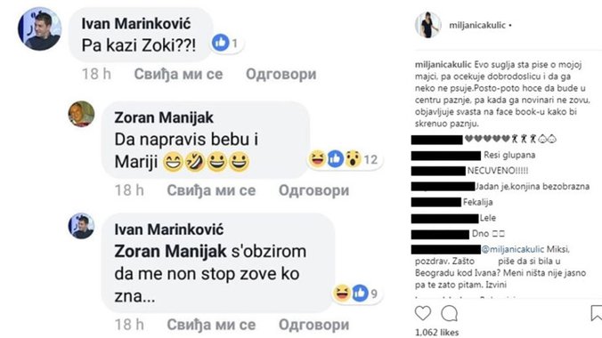 Kulićeva je na svom zvaničnom Instagram profilu objavila fotografiju na kojoj je nekoliko komentara iz Ivanove objave, kao i sam Marinkovićev komentar. Njemu je jedan od pratilaca predložio da napravi dete i Miljaninoj majci Mariji Kulić. Nakon što je Ivan napisao: "Ko zna", Miljanu je to uvredilo zbog čega nije ostala imuna na reči oca njenog deteta.