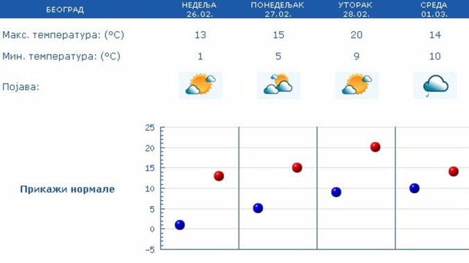 U sredu prolažno naoblačenje sa kišom, na višim planinama sa snegom, uz manji pad temperature. Od četvrtka pretežno sunčano i toplo.