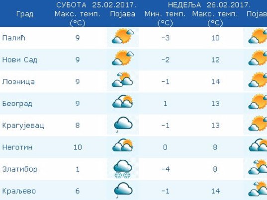 Vetar umeren, jugoistočni. Najniža temperatura od minus 1 do 1 C, najviša oko 13 C. Prema izgledima vremena za sedam dana, u ponedeljak će biti umereno oblačno i malo toplije, a u utorak pretežno sunčano s maksimalnom temperaturom ponegde i do 20 C.