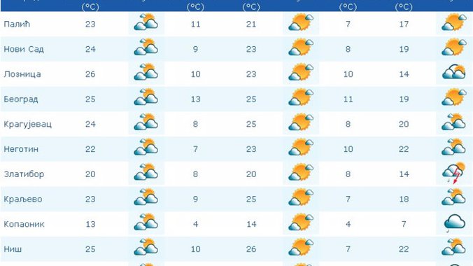Jutarnja temperatura od 5 do 13, najviša dnevna od 22 do 26 stepeni.