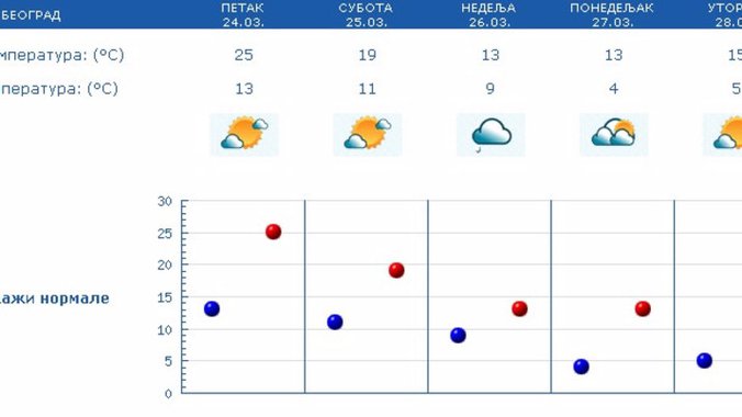 U Beogradu će biti pretežno sunčano i toplo. Vetar slab i umeren, prepodne jugoistočni, posle podne zapadni i severozapadni. Jutarnja temperatura oko13, najviša dnevna oko 25 stepeni.