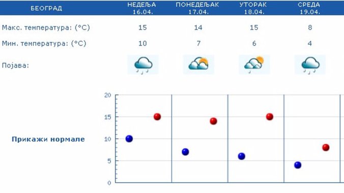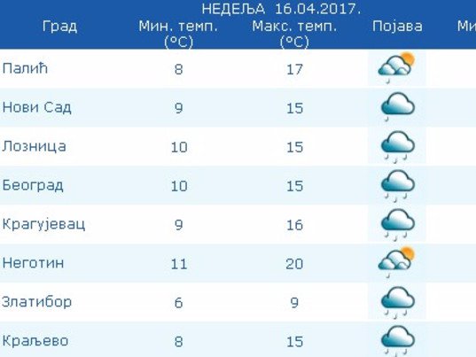 Vetar umeren, povremeno i jak, severozapadni. Jutarnja temperatura od 7 do 11, najvisa dnevna od 14 do 20 stepeni, saopštio je Republički hidrometerološki zavod.