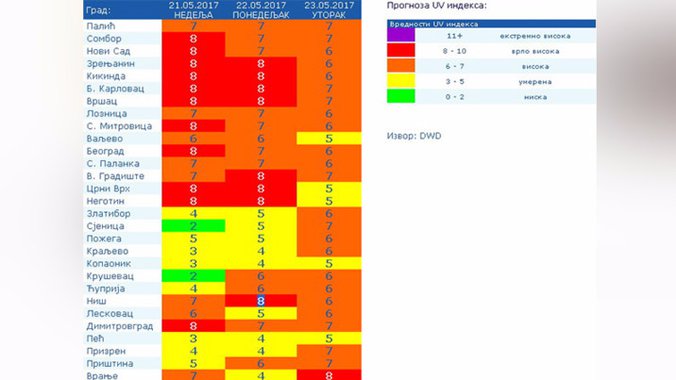 Indeks zračenja će, prema prognozama RHMZ, u većini mesta u Srbiji biti visok (indeks 7), a veoma visoko zračenje očekuje se u Zrenjaninu, Kikindi, Vršcu, Bačkom Karlovcu, Sremskoj Mitrovici, Velikom Gradištu, Crnom Vrhu, Negotinu i Nišu.