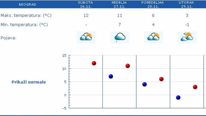 Jutarnja temperatura od 0 do 6, najviša dnevna od 10 do 15 stepeni.