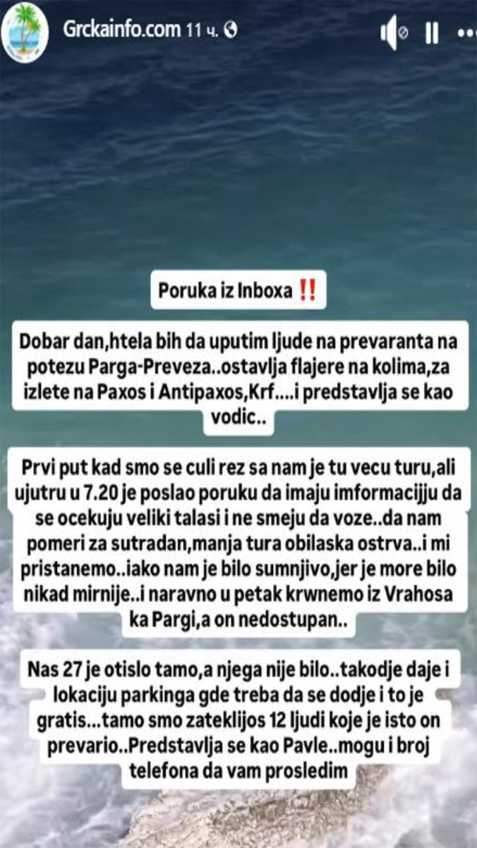 - Htela bih da uputim ljude na prevaranta na potezu Parga - Preveza. Ostavlja flajere na kolima, za izlete na Paksos i Antipaksos, Krf i predstavlja se kao vodič. Prvi put kada smo se čuli sa njim rezervisali smo tu turi, ali ujutru u 7.20 sati je poslao poruku da imaju informaciju da se očekuju veliki talasi i da ne smeju da voze. Pomerio nam je za sutradan, navodno manja tura obilaska ostrva. I mi pristanemo iako nam je bilo sumnjivo, jer je more bilo nikad mirnije. I naravno, ipak, krenemo iz Vrahosa ka Pargi, kad on nedostupan... - napisala je jedna žena, a objavljeno je na Fejsbuk stranici Grčka info.