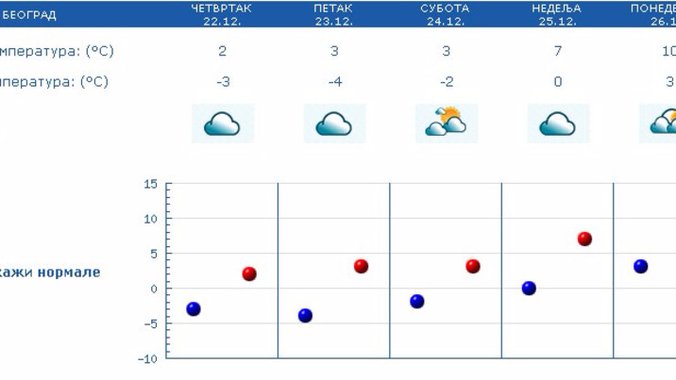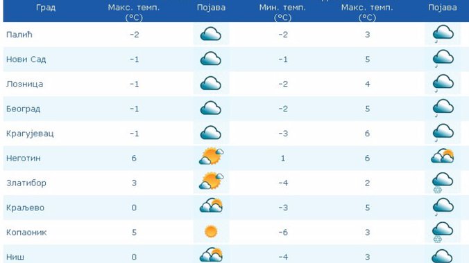 U Beogradu će ujutru biti mraz i magla. U toku dana pretežno oblačno i malo toplije sa kratkotrajnom slabom kišom, ujutro i pre podne uz stvaranje poledice. Najniža temperatura biće -3, najviša 5 stepeni.
