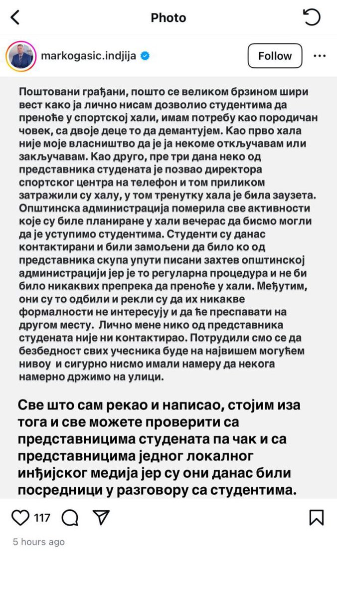 A istina je, nju je Marko Gašić objavio na instagramu, da je na prvi poziv studenata otkazao sve druge događaje u sportskoj hali da bi oni tamo mogli da se smeste, i da je samo zatražio da mu pošalju formalni pisani zahtev, pošto se tako u svetu radi. Studenti su, međutim, rekli da njih formalnosti ne zanimaju, i odlučili da spavaju na otovrenom. Goran Ješić, reaktivirani političar koji se šlepuje uz studente, bivši gradonačelnik Inđije, to je svakako znao. Ali ni u njegovim objavama nema mesta za istinu…