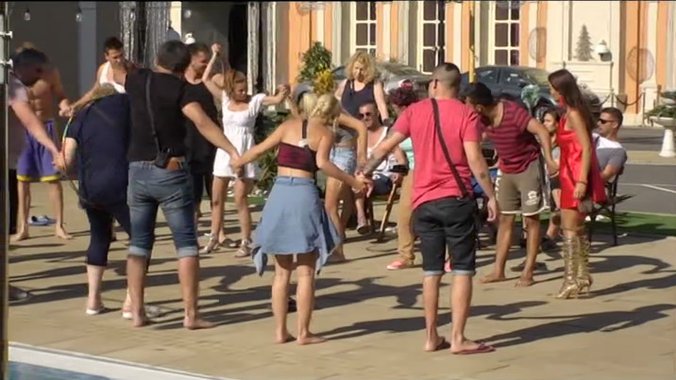 Zadrugari su danas igrali još jednu igru, što je postala tradicija četvrtom. Naime, oni su morali da se podele u četiri grupe i stanu pored bazena, dok su, držeći se za ruke, prebacivali obruč jedno drugom.